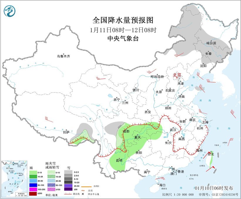 1月11日08时至12日08时,内蒙古东北部、东北地区中部、西藏东南部、川西高原北部等地部分地区有小到中雪或雨夹雪。西藏东南部、湖北西南部、湖南西北部、西南地区东南部、台湾岛东部等地部分地区有小雨。西藏中部、甘肃北部、内蒙古中西部、宁夏北部、陕西西部、山西北部、河北北部、山东半岛、辽东半岛等地部分地区有5~7级大风、阵风8~9级。渤海、渤海海峡、黄海大部海域、东海大部海域、台湾海峡、台湾以东洋面、巴士海峡、南海东北部和中部海域、南海西南部海域将有7~8级、阵风9~10级的大风,其中台湾海峡、巴士海峡、南海东北部的部分海域风力可达9级、阵风10~11级。