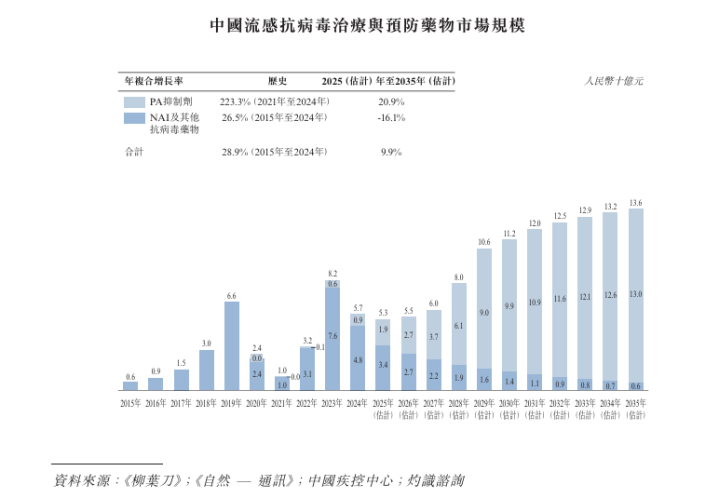 中国2024年流感抗病毒药物市场规模为人民币57亿元,其中NAI及其他抗病毒药物市场规模为人民币48亿元,PA抑制剂市场规模为人民币9亿元。预计到2035年该市场规模将达到人民币136亿元,其中PA抑制剂和其他抗病毒药物占人民币130亿元,NAI则占人民币6亿元