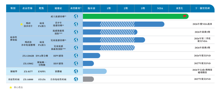 利用商业化药物资产及综合小分子药物研发平台,公司已开发出六个药物资产管线,包括商业化玛硒洛沙韦片、一款针对儿童流感患者的临床后期玛硒洛沙韦乾混悬剂型、一款用于治疗实体瘤的ZX-8177(一期临床阶段),以及针对人类乳头瘤病毒(「HPV」)感染的处于IND申报阶段的ZX-12042B药物。公司还有两种针对单纯疱疹病毒(「HSV」)感染及自身免疫性疾病的临床前候选药物。